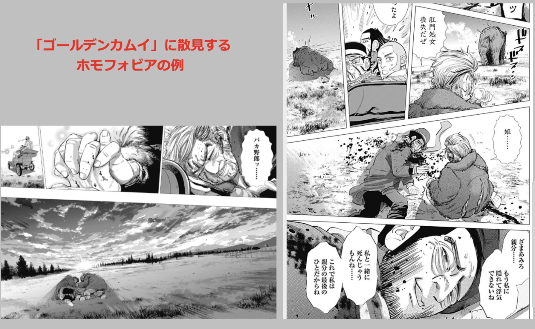 漫画版の「ゴールデンカムイ」の差別的表現 👆続)このゲイカップルの「道化扱い」は徹底していて、恋人を救おうとして共倒れになったシーンでは「フェイクの感動コマ」が見開きで登場する。そして次コマで「感動し ..." width="758" height="758" srcset="https://i0.wp.com/pbs.twimg.com/media/FfrNFrEVsAIe27D.jpg:large?resize=300%2C300&ssl=1 300w, https://i0.wp.com/pbs.twimg.com/media/FfrNFrEVsAIe27D.jpg:large?resize=768%2C768&ssl=1 768w, https://i0.wp.com/pbs.twimg.com/media/FfrNFrEVsAIe27D.jpg:large?resize=192%2C192&ssl=1 192w, https://i0.wp.com/pbs.twimg.com/media/FfrNFrEVsAIe27D.jpg:large?resize=384%2C384&ssl=1 384w, https://i0.wp.com/pbs.twimg.com/media/FfrNFrEVsAIe27D.jpg:large?resize=561%2C561&ssl=1 561w, https://i0.wp.com/pbs.twimg.com/media/FfrNFrEVsAIe27D.jpg:large?resize=265%2C265&ssl=1 265w, https://i0.wp.com/pbs.twimg.com/media/FfrNFrEVsAIe27D.jpg:large?resize=531%2C531&ssl=1 531w, https://i0.wp.com/pbs.twimg.com/media/FfrNFrEVsAIe27D.jpg:large?resize=364%2C364&ssl=1 364w, https://i0.wp.com/pbs.twimg.com/media/FfrNFrEVsAIe27D.jpg:large?resize=728%2C728&ssl=1 728w, https://i0.wp.com/pbs.twimg.com/media/FfrNFrEVsAIe27D.jpg:large?resize=608%2C608&ssl=1 608w, https://i0.wp.com/pbs.twimg.com/media/FfrNFrEVsAIe27D.jpg:large?resize=758%2C758&ssl=1 758w, https://i0.wp.com/pbs.twimg.com/media/FfrNFrEVsAIe27D.jpg:large?resize=85%2C85&ssl=1 85w, https://i0.wp.com/pbs.twimg.com/media/FfrNFrEVsAIe27D.jpg:large?resize=171%2C171&ssl=1 171w" sizes="(max-width: 758px) 100vw, 758px" onError="document.getElementById('image-collection-item-1of33-18').remove();"/>
